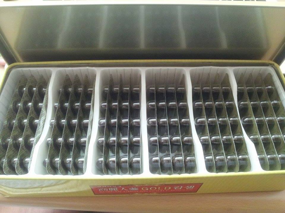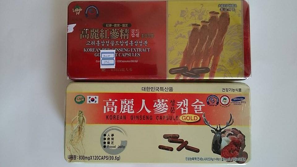 Hộp thiếc màu đỏ - trắng sữa, có hình 1 con Hươu, nấm linh chi và 1 củ Nhân Sâm. 1 hộp chứa 24 vỉ X 5 viên = 120 viên nang mềm(830mg/1 viên)